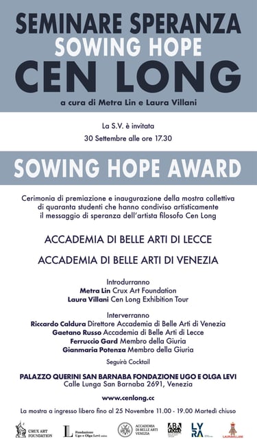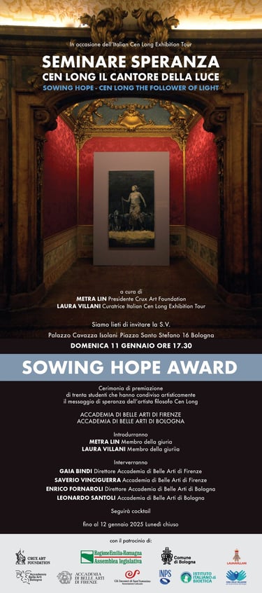 The theme "Sowing Hope" was chosen to inspire and challenge the creative minds of the Academy. In these times of uncertainty and change, hope represents a beacon of light and a catalyst for resilience and creativity. Collaborating with the Academy of Fine Arts of Bologna (Prof. Lenardo Santoli) and Florence (Prof. Saverio Vinciguerra), we aim to create a diverse range of artistic expressions that reflect on the transformative power represented by Hope. This collaboration is intended to provide students and recent graduates with a prestigious platform to showcase their talents on an international stage. The provision of an organization will allow students to connect with established artists and professionals in the art world, creating valuable networking opportunities abroad. The competition will also be significantly promoted to attract artists and art enthusiasts from around the world, with the intention of contributing to the visibility of the students and the institution of the Academy of Fine Arts during the exhibition at Palazzo Cavazza Isolani. The Crux Art Foundation and the Hann Art Agency are committed to providing the resources and logistical support necessary for this collaboration to enhance the creative potential of talented students and graduates. The "Sowing Hope Award", the "Sowing Hope" artistic competition, aims to be not only a celebration of art but also an exploration of the lasting power of Hope. The selected works will be exhibited and published in a volume on the Italian Cen Long Exhibition Tour. The five finalists will be awarded during a ceremony on January 11, 2025, and the winner of the "Sowing Hope Award" will be invited to hold a solo exhibition at a museum in Taiwan.